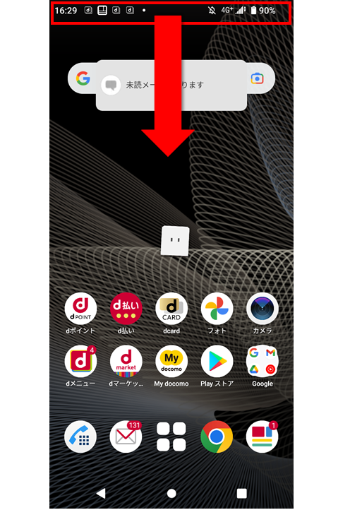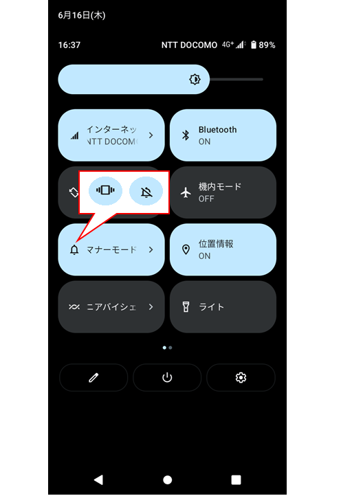 ②通知パネルが表示されます。表示されたアイコンを押してマナーモードを設定します。スマホが震えているのが、バイブレーションありのマナーモード、ベルに斜線が入っているマークがバイブレーションも振動しないサイレントマナーモードです。